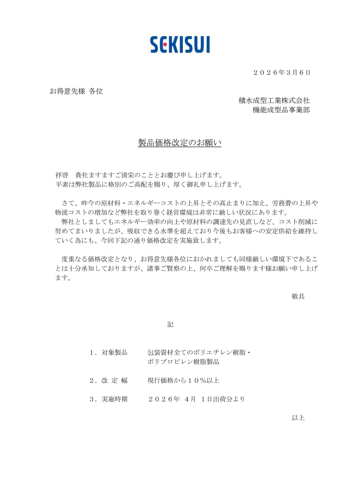 平素は積水成型工業ホームページをご利用いただきまして、有難うございます。