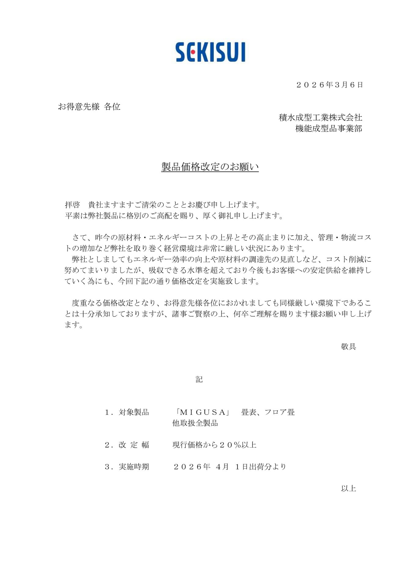 MIGUSA製品 価格改定のお願い