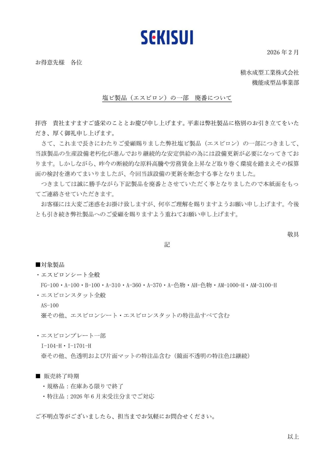 平素は積水成型工業ホームページをご利用いただきまして、有難うございます。製品廃番のお知らせを以下にご案内いたします。