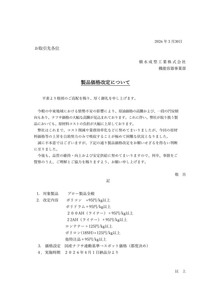 平素は積水成型工業ホームページをご利用いただきまして、有難うございます。