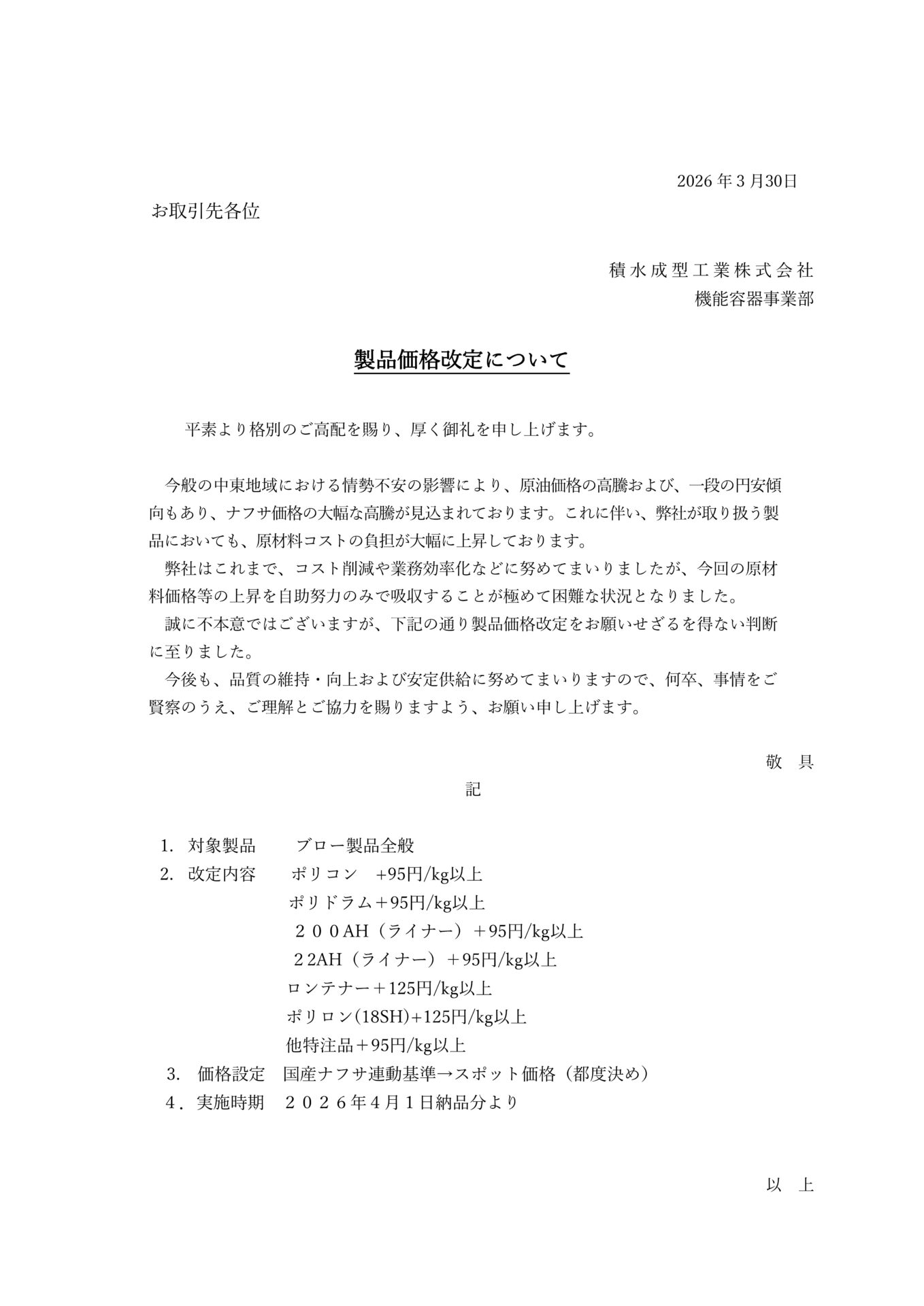 価格改定のお知らせを以下にご案内いたします。