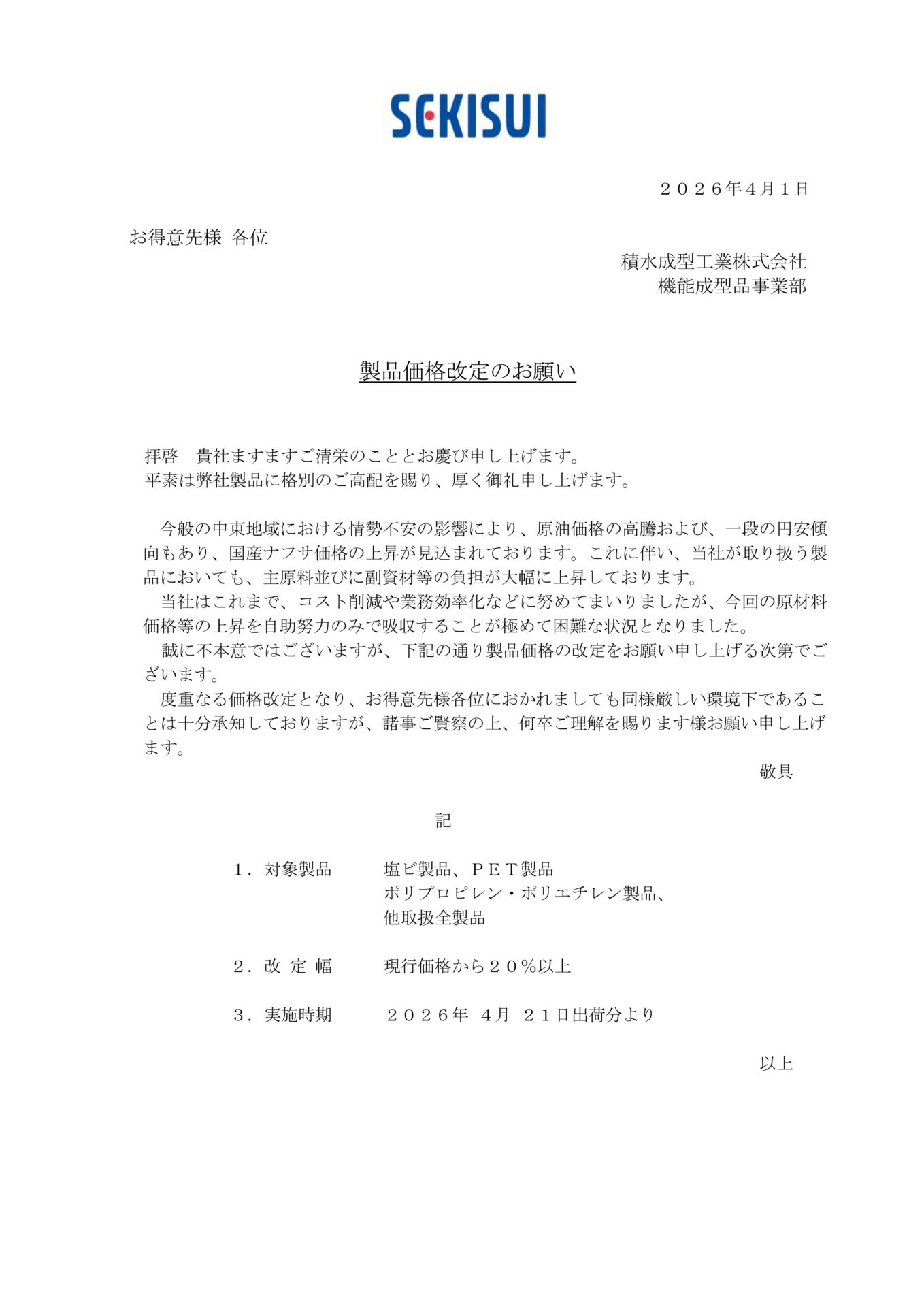平素は積水成型工業ホームページをご利用いただきまして、有難うございます。